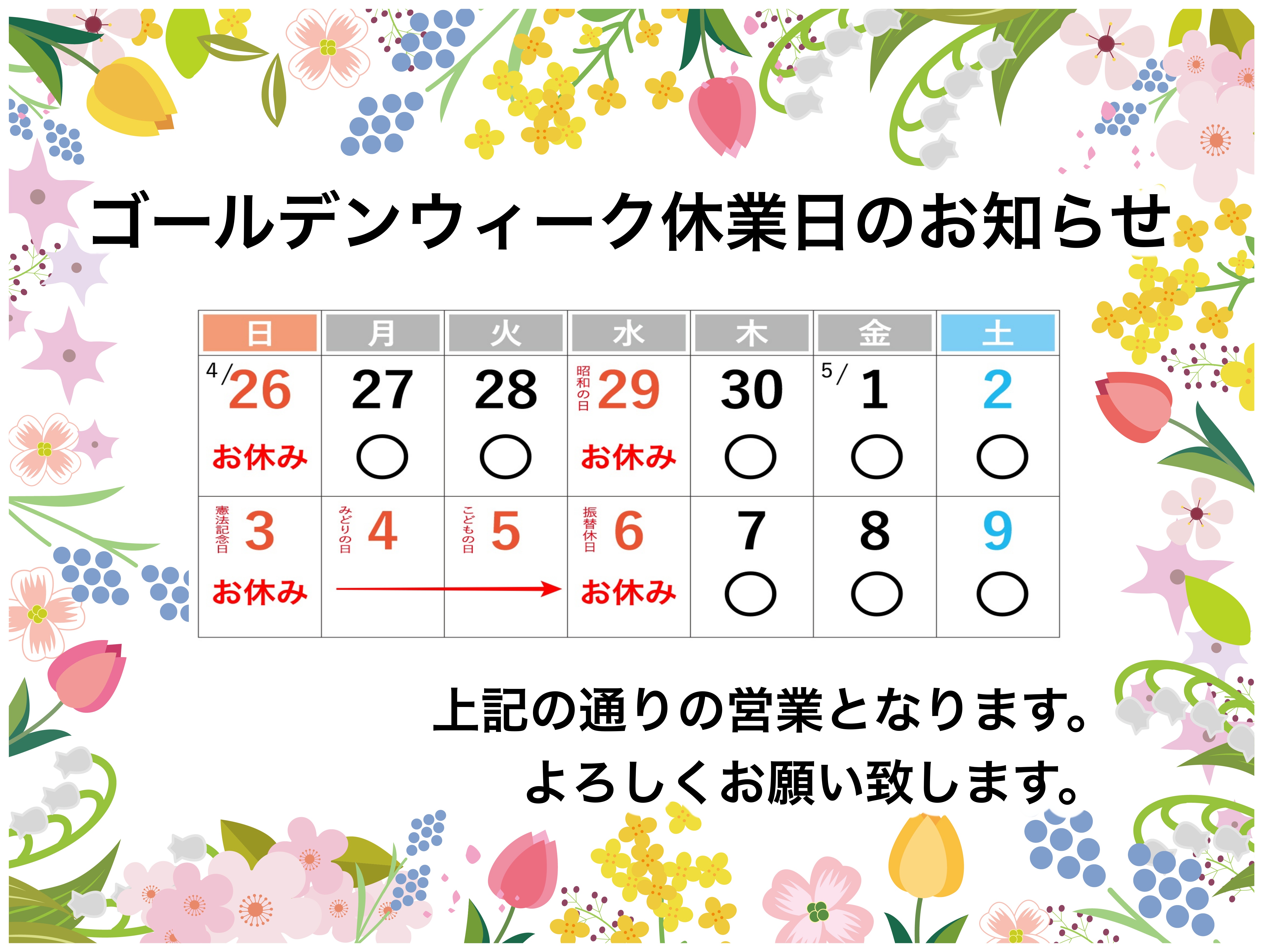 ゴールデンウィーク期間中は、4月29日(水)および5月3日(日)~6日(水)まで休業とさせていただきます。